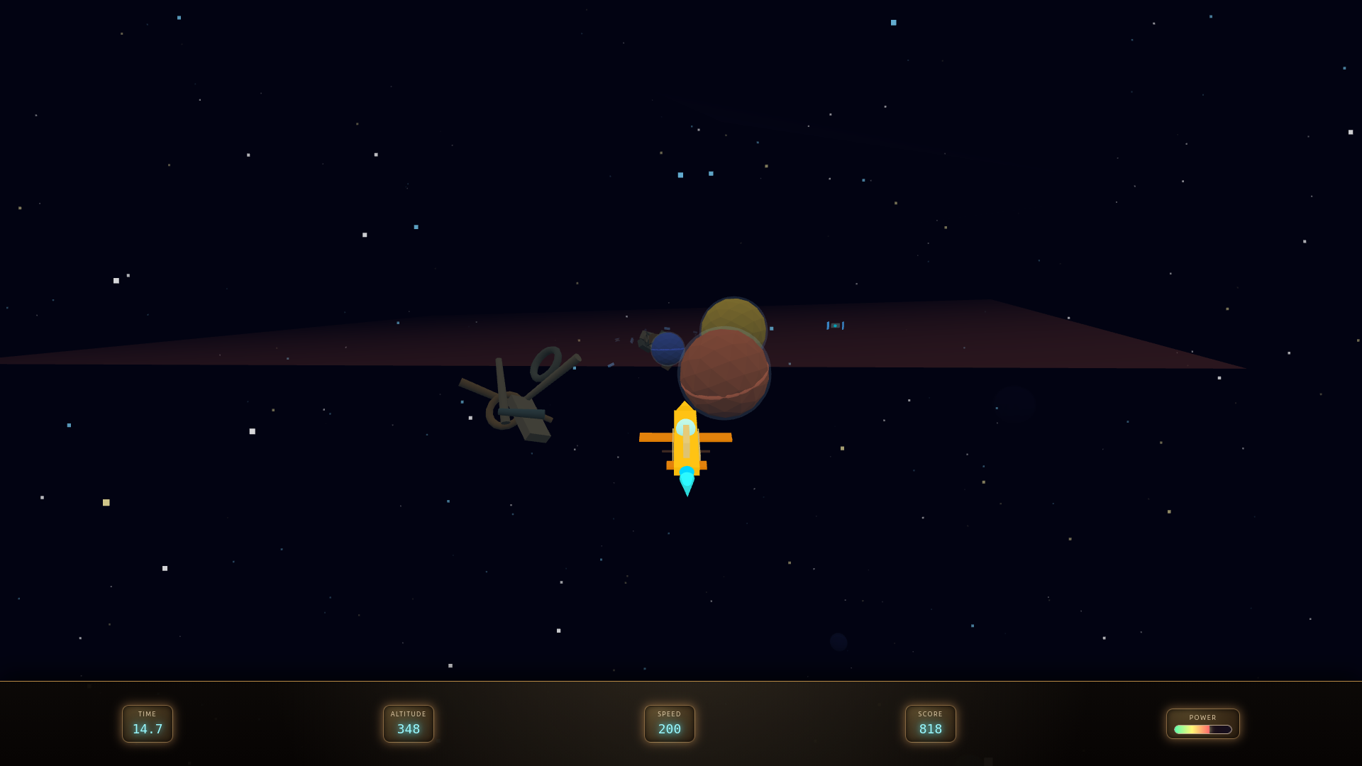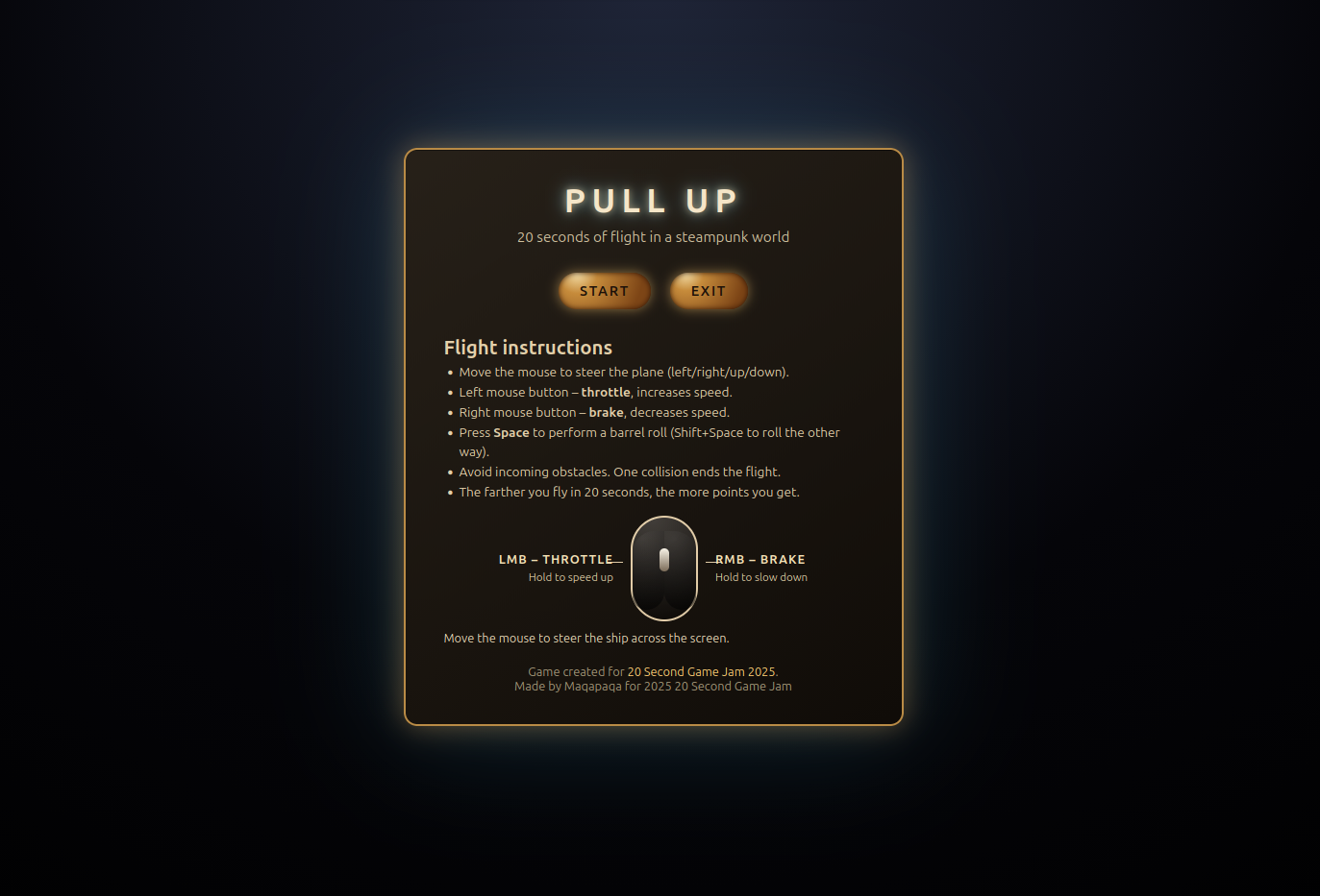 [fullscren recommended] Pull Up is a fast-paced 3D steampunk flight game where you pilot a yellow retro‑futuristic aircraft through a dense field of planets, scrap and hunting satellites in deep space. You have only 20 seconds to survive: steer with the mouse, throttle with LMB, brake with RMB and use barrel rolls to thread through impossible gaps. The further you fly without crashing, the higher your score climbs as the universe becomes increasingly hostile and spectacular.